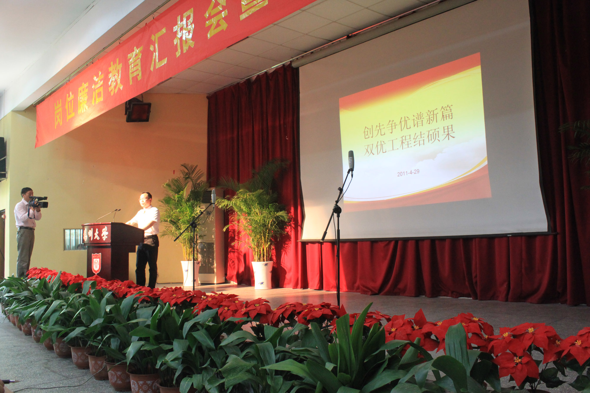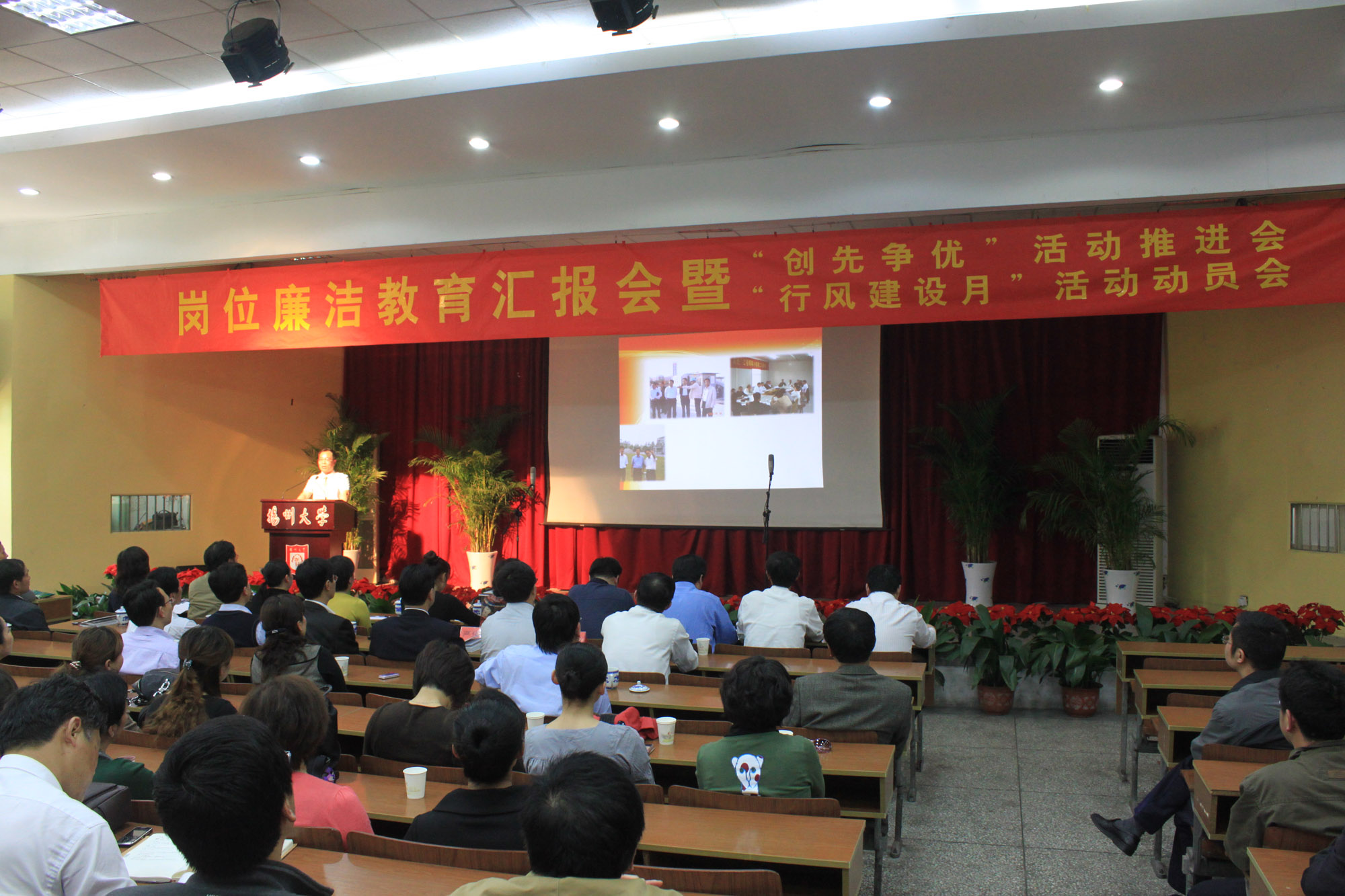 4月29日下午,后勤党委举行了岗位廉洁教育汇报会暨“创先争优”活动推进会、“行风建设月”活动动员会,基建处全体职工参加会议,曹所江同志作了“创先争优谱新篇,双优工程结硕果”的汇报演讲。校党委常委、纪委书记严华海、副校长叶柏森应邀出席并讲话。