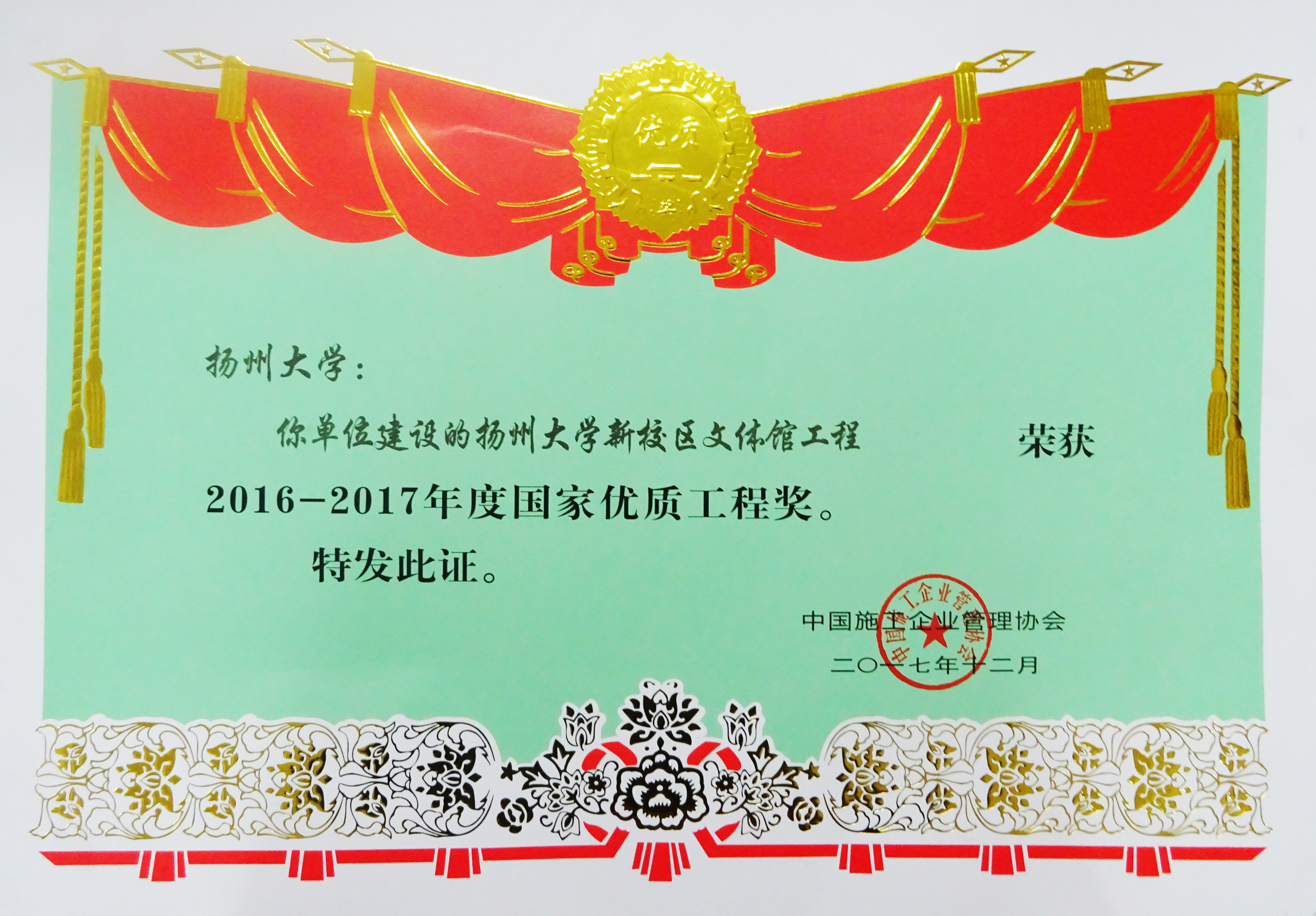 近日,2016-2017年度国家优质工程奖总结表彰大会在北京人民大会堂召开。会议表彰了2016-2017年度国家优质工程奖、2016年度中国施工企业管理协会科学技术奖的获奖企业和先进个人。学校扬子津校区文体馆工程喜获2016-2017年度国家优质工程奖,这是我校继2001年中心校区教学实验楼工程(即荷花池校区教学主楼)、2011年扬子津校区图书馆工程之后第三次获此殊荣。文体馆工程项目负责人曹所江同志被授予“2016-2017年度国家优质工程奖突出贡献者”荣誉称号。