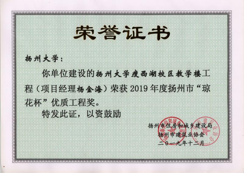 瘦西湖校区教学楼工程荣获2019年度扬州市“琼花杯”优质工程奖