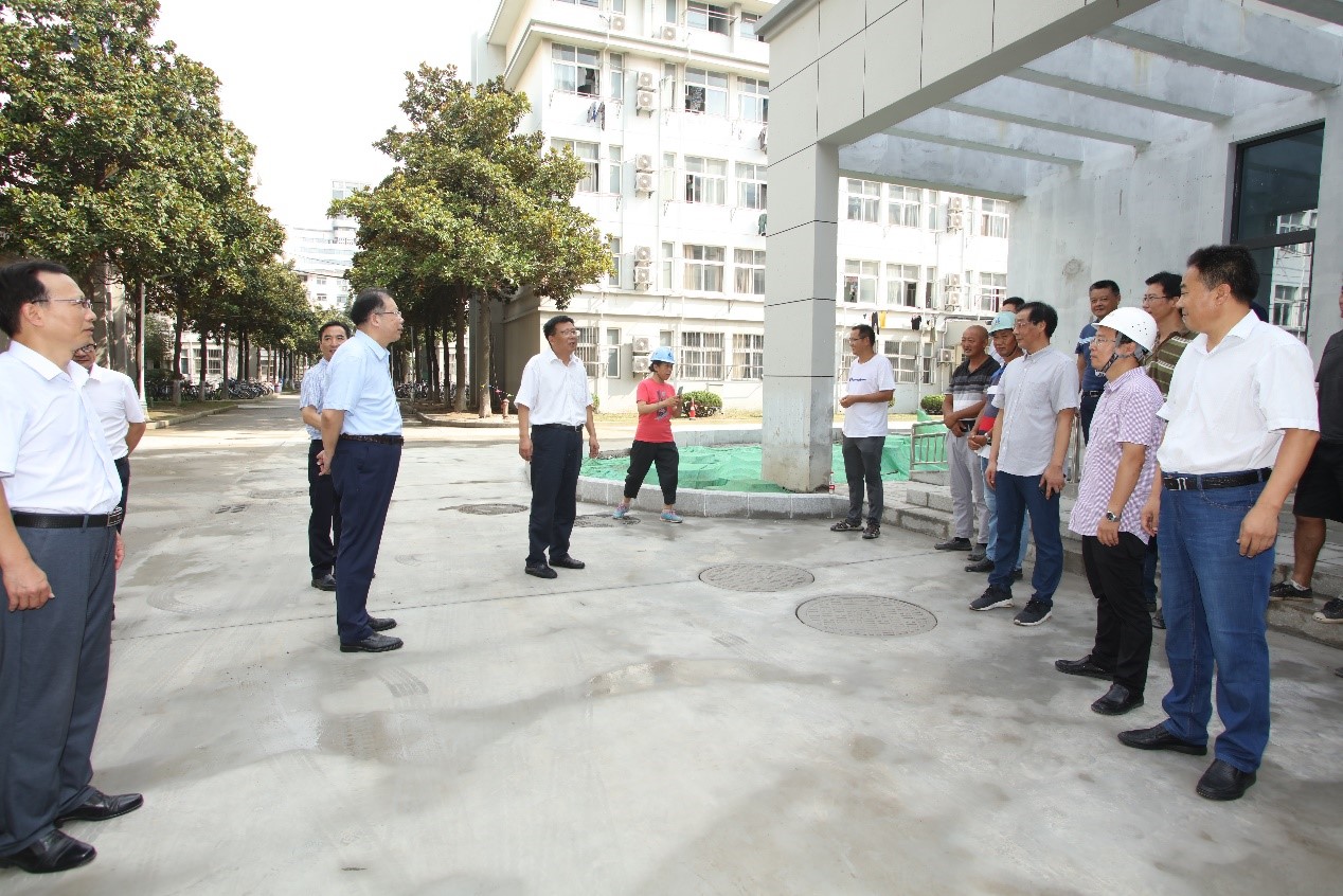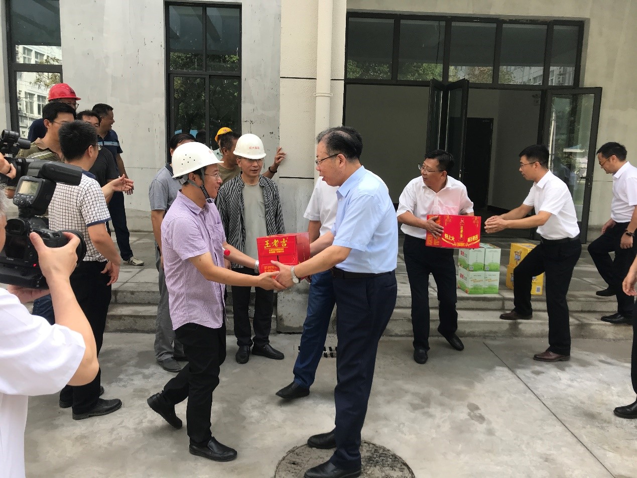 9月1日上午,校党委书记姚冠新来到文汇路校区生活服务楼工程,现场察看了解暑期工程实施进展情况,亲切看望慰问冒着酷暑坚守在工作岗位上的基建处干部职工,并送上清凉防暑慰问品。副校长洪涛代表学校向暑期奋战在一线的基建处管理人员以及施工、监理单位工作人员表示感谢,并希望各参建单位严把工程质量、安全关,做好项目竣工收尾工作,迎接新学期开学。党办、教务处、国资处、后保处、保卫处、信息化处等部门负责同志陪同察看。
