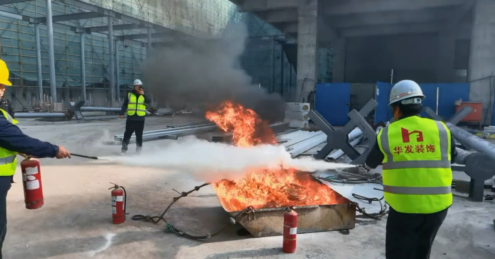在生命科学大楼工地现场,各参建方工作人员共同观看消防安全视频,学习如何应对火灾发生及火场逃生等消防安全知识。在消防应急演练中,现场模拟火情,灭火人员手持灭火器,喷向熊熊燃烧的大火,瞬间将大火掩盖并扑灭。随后,专职消防员在现场详细讲解灭火工具的种类及使用方法,部分人员在指导下进行了操作学习。