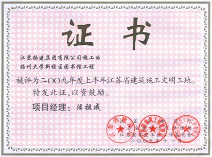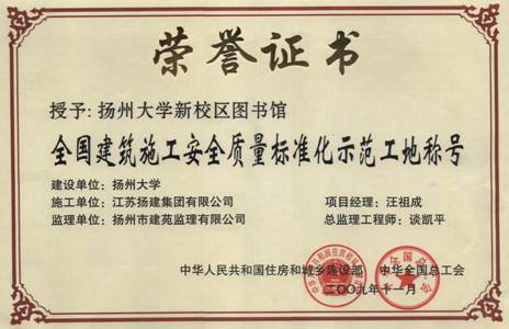 2009年11月获得中华人民共和国住房和城乡建设部、全国总工会“全国建筑施工安全质量标准示范工地”